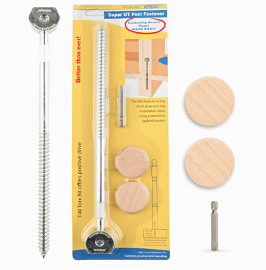 Discover the ZipBolt UT Super Bolt, designed for quick and easy wrench-free installation of staircase newel posts. This innovative fastener is perfect for both residential and commercial use, providing a reliable and durable connection. The ZipBolt UT Super Bolt features an overall length of 11 inches and a depth of 5-1/2 inches into the foundation wood support. It includes a T-40 Torx Bit that can be used in a drill or socket, as well as red and white oak 1-1/2" tapered plugs.